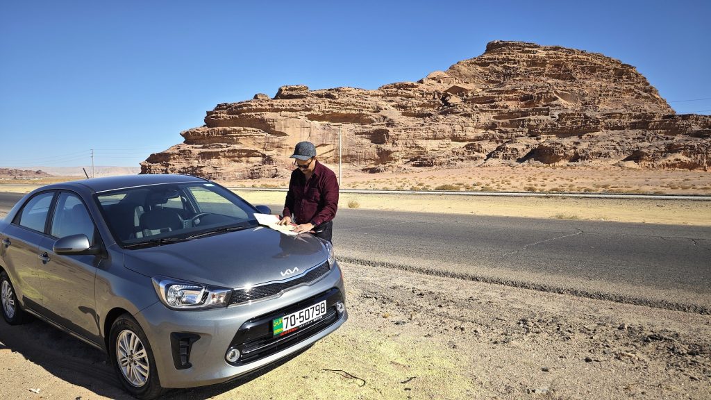 Drive south for about 300 km (approx. 3.5 to 4 hours) toward Ras al-Naqab (past Ma’an and Shobak). Turn left at the Wadi Rum turn-off near the village of Diseh or Ramm (look for signs saying ‘Wadi Rum Protected Area‘ or ‘Wadi Rum Visitor Centre‘). Continue on the Wadi Rum Road (a paved local road) for about 25 km until you reach the Visitor Centre and the entrance to the protected area. The total drive time is around 4 to 5 hours, depending on stops. Fuel up before you enter Wadi Rum — no gas stations inside the protected area. Use Google Maps or an offline GPS app; signage is generally good but sparse in the final stretch.