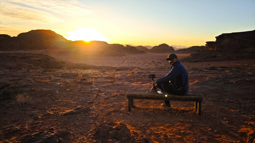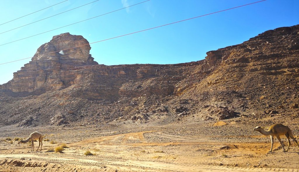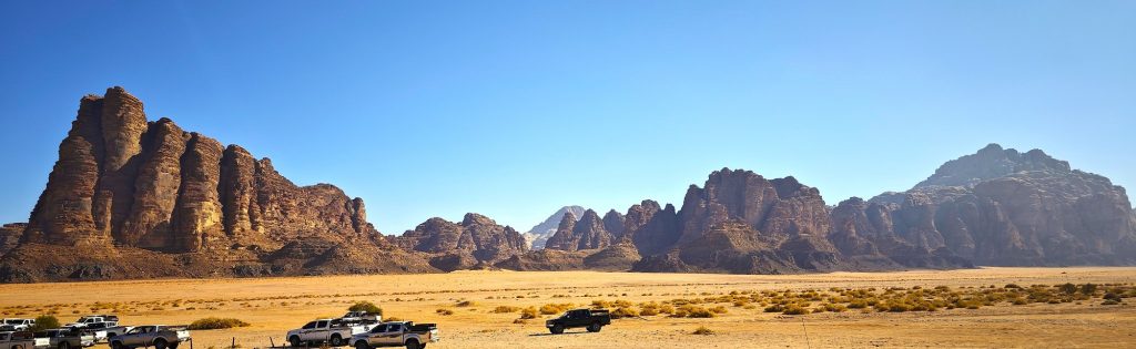 After what felt like a long drive from Madaba, towering rock formations began to rise in the horizon. As we approached Wadi Rum, the landscape transformed dramatically — we began to see a stunning range of sandstone and granite mountains rising sharply from the flat desert floor — a sure sign that Wadi Rum was drawing near. We stopped in front of one such formation to enjoy the view.