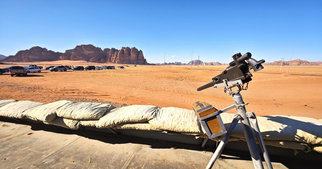 We boarded the ancient train and found a seat in front of a rifle strategically positioned with a soldier taking care of it. As the old steam locomotive began to chug through the desert with the giant Wadi Rum mountains on both sides, we and the rest of the passengers found ourselves surrounded by more actors dressed as Ottoman soldiers, complete with vintage uniforms and rifles.