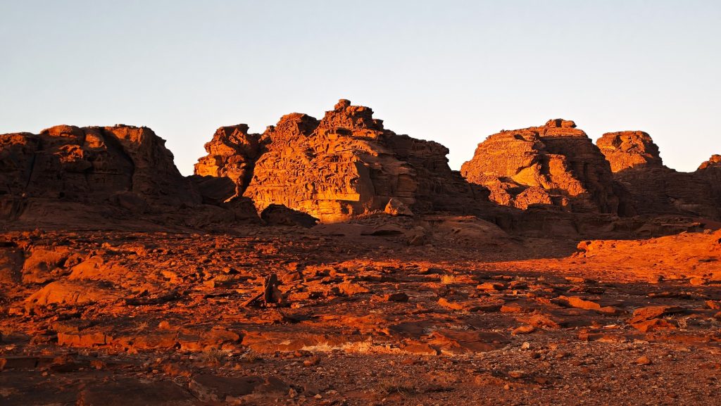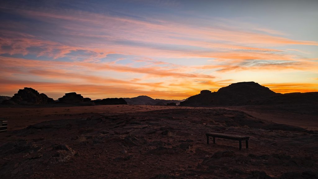 The name Wadi Rum comes from the Arabic ‘wadi’ (valley) and likely ‘Iram’, an ancient tribe. But locals simply call it ‘The Valley of the Moon’, and that’s exactly how it felt sitting there at dusk. The red sand glowed like embers and the sky turned the color of fire and the Rum’s silence was profound. We just sat and sat witnessing a mesmerizing sunset across the horizon with not a soul in sight. And we sat until we couldn’t see ourselves in the dark, taking in the tranquility and the emptiness of the place -a place that felt both impossibly old and impossibly otherworldly.