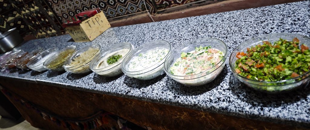 But the dinner counter was also spread out with other staples like lentil soup, labneh, olives, flatbread , a variety of salads and spreads, and of course sweet Bedouin tea.